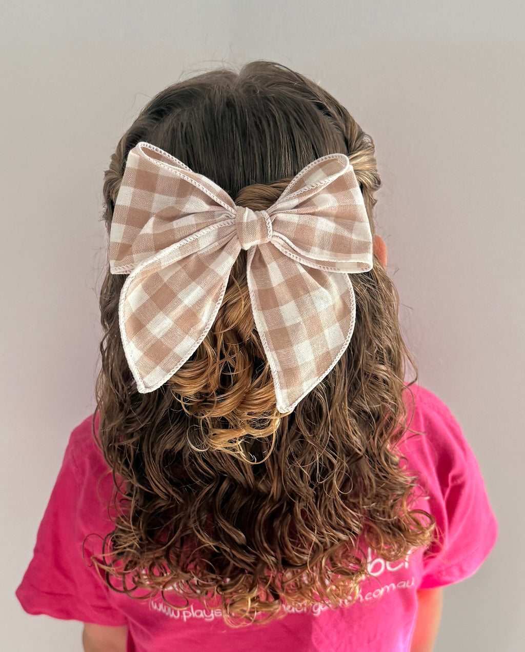 πŸ‘‰ Add the sweetest finishing touch to your little one’s outfit with the Mae & Rae Lola Bow Clip β€” available in Sand, Teal & Beige Gingham.