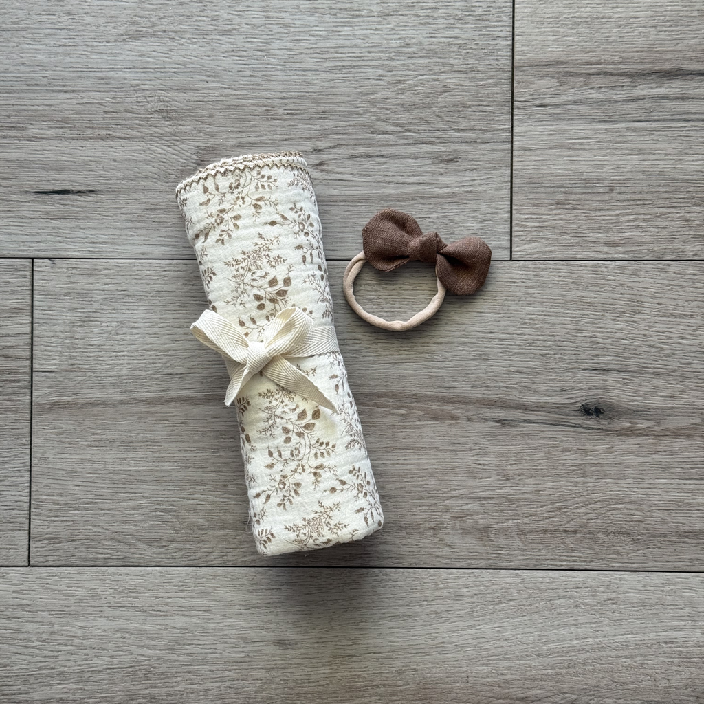 Choose any one of our soft, scalloped edge swaddles and pair it with a matching (or contrasting) Mae & Rae Signature Bow to create the perfect newborn set.