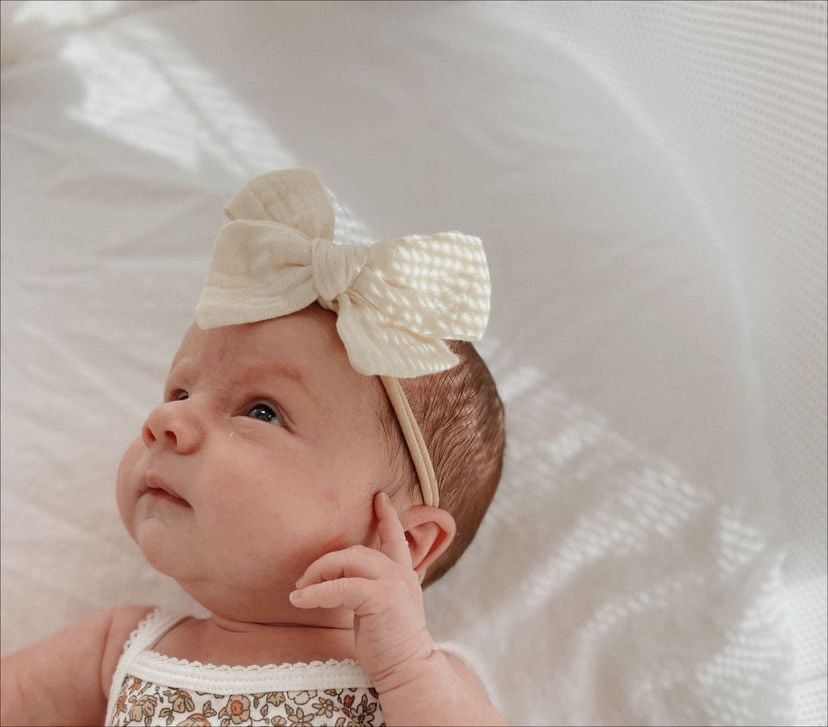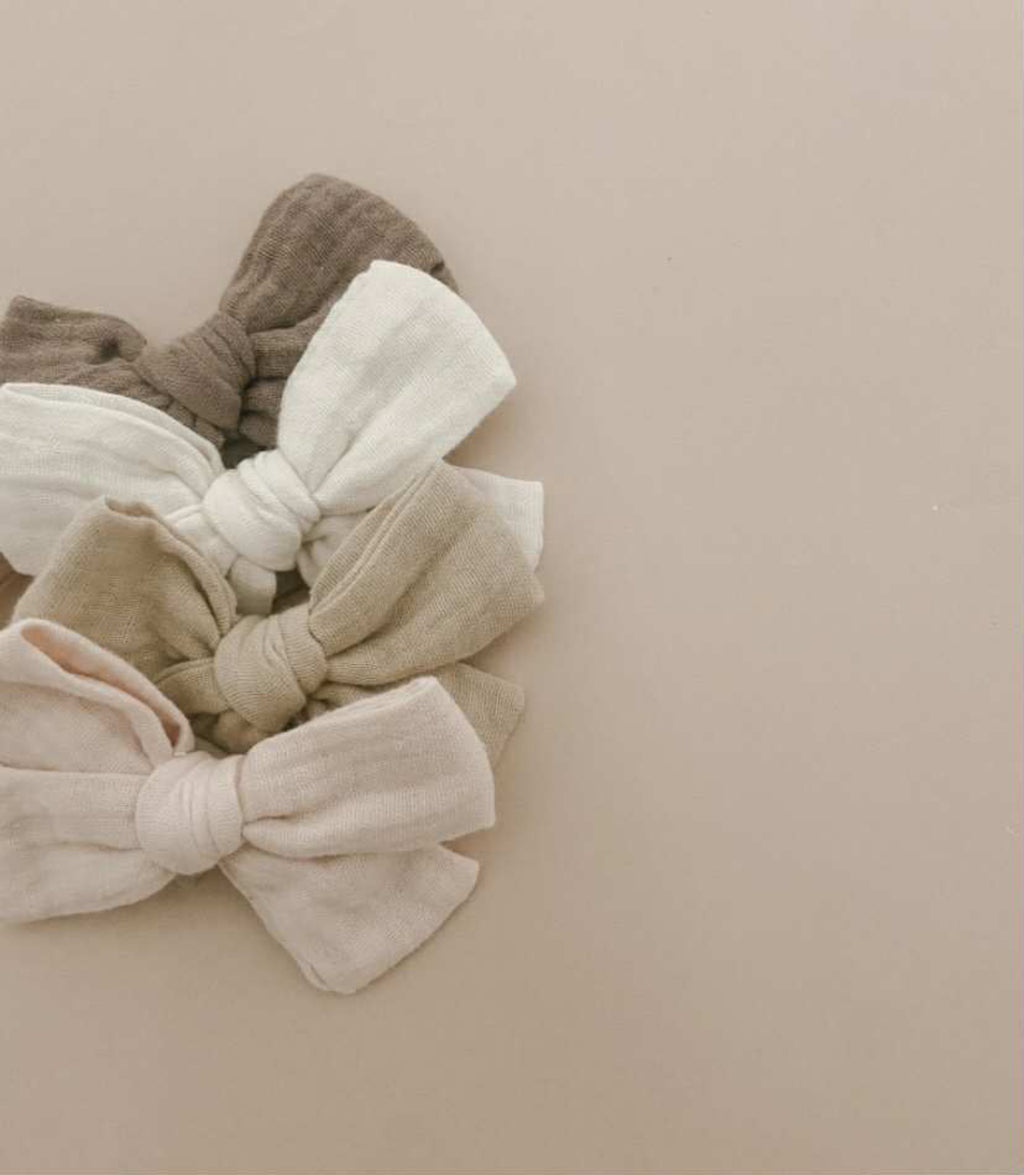 The Mae & Rae Gauze Fabric Bows are a best-selling favourite, loved for their soft texture and effortless style. Made with love, these bows are crafted from lightweight gauze fabric, making them the perfect everyday accessory for newborns, toddlers, and beyond. Available in four beautiful shades β€” Brown, Golden, Cream, and Pale Pink.